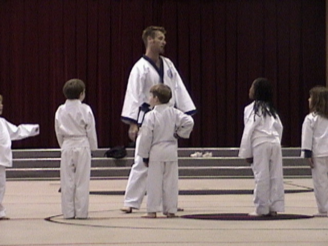 Both boys are taking classes one day a week as part of after school enrichment programs. Brad is taking Spanish and Doug is taking karate. Haven't heard too much out of Brad about Spanish, but Doug loves his karate class. By the time Doug quit his twice weekly karate lessons in the summer of 2000, it was quite an ordeal to get him motivated to go. He seems to have forgotten all that (a wonderful gift kids have), and is really, really enjoying it currently. His last class was at a studio in a strip mall; this class is taught by the instructor in school gym (or multi-purpose room, which is what they call the gym when it is also used for lunch room and after school karate). |