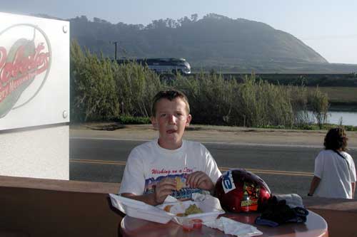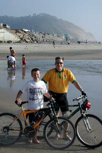 Keith and Brad got serious about the upcoming Ride Across California in April.  Throughout March, they took training rides every weekend.  This usually took some doing, since Saturdays were already full of baseball (Brad, Doug, and Coach Keith) and basketball (Brad and scorekeeper Keith).  But the 5 Cities Bike Ride in February helped focus Brad, and together Brad and Keith made the training rides occur.  On March 9th, Keith realized a goal he had had since moving to Penasquitos in 1994 (or maybe just since Kristi gave him the mountain bike in 1998): he rode to the Ocean from the house.  Keith and Brad completed the Pipestone to the Pacific, then turned it into a 20 mile, 4 hour circle tour by returning via the Penasquitos Canyon preserve, the locale for Brad’s Deli Runs.  Over 10 of the total 20 miles were off pavement, on dirt roads and trails gouged by the February rains. The organized Bike Club rides for the month deserve their own page .