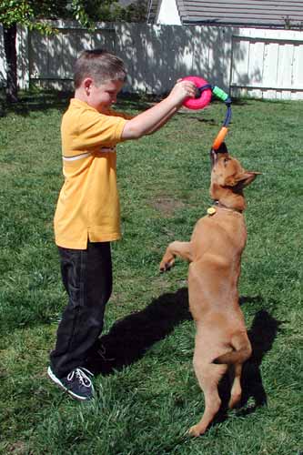 Doug has made his peace with her, and no longer seems to be her favorite target.  I think she is clear that she is below Doug on the pack totem pole. Brad, on the other hand, means rough-housing to Dancer, whether Brad wants to or not.  Everything he does from hand motions to verbal "No!" is promptly interpreted as playing, and she just keeps her nipping play going.