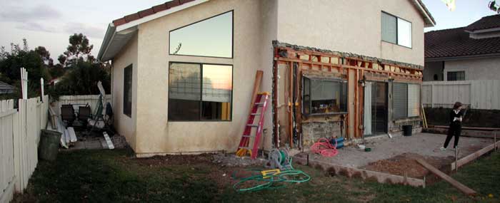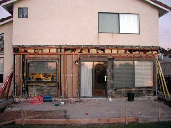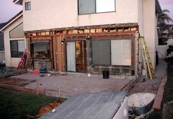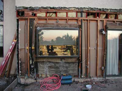 Stucco has been very noisily removed from the back of the house. The air compressor and power chisel were very hard on Dancer; even more so than the jack hammering.  Old patio has been cleared of broken up concrete.  The difference in ground color is interesting: the white that Kristi is standing upon is the natural clay of the area, while the brown is the imported soil that came with the sod that used to reside there.  Note plank over moat for Dancer.
