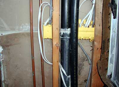 A close up of the down spouts from the sink and bathtub in the master bath.  Note the break in the bath down spout at its junction right between the yellow electrical boxes. Had been this way for years, apparently.  Note water damage to wall board below it to left and to right.