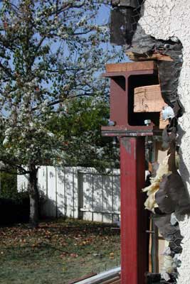 The beam is in, but not yet bolted securely on this end of the house. Notice