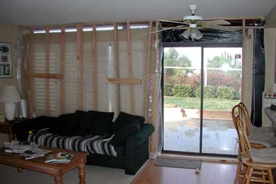 the wall board near to it with sheet plastic. The side yard slab is pressed into service immediately as storage area. |