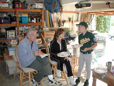 Here are Art, Kristi, and Brad in the morning eating breakfast before baseball in the only place we can: among the stacks of stuff in the garage. |