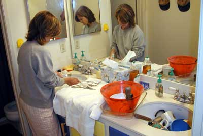 Adroitly improvising, Kristi uses the boys' bathroom and its dual sink set