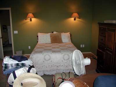 This is a good view of the one regret Kristi is developing. (We've made literally hundreds of choices, so if just one is being questioned, we are in good shape!)  We wall mounted the lamps and ran lines to them inside the wall.  So the bed is practically chained to this very spot.  Kristi thinks we may need to move it, perhaps only a few inches to the left to make more access room for the furniture we'll be putting on the right wall.