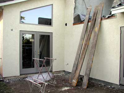 The stucco guys finally got their truck fixed and showed up.  They got halfway through the job before Craig stopped them and said the color match wasn't good enough to the old stucco.  Too yellow.  He sent them home and told them to bring the right color tomorrow to finish of the job and to cover what was done today.