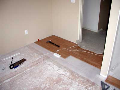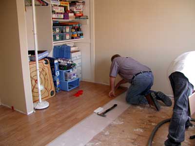 Office is completely painted (well, except for the closet interior, and that's a long term project to get shelving in there) and the electrical plate covers are up.  Last job is the floor.  Kristi and Keith were originally going to do this themselves, as it couldn't be too hard to install click-in laminate flooring.  But then in a classic case of "feature creep" we decided to add it to Craig's list of jobs.