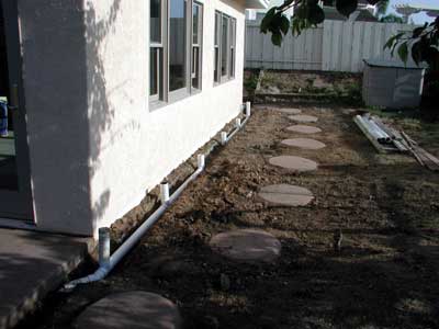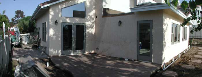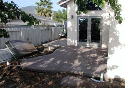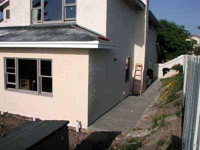The concrete patio and side walk are poured.  Again, the kids were at school and missed their opportunity to immortalize themselves in the cement.  Work in the backyard shifts to sprinklers and drains (all cut when the foundation for the addition was put in) while work inside is to prepare for the last major job of the remodel, the tiling of the addition.