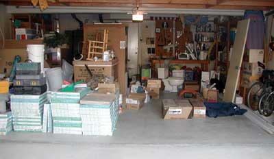 The garage is beginning to fill up. In addition to the new refrigerator and stove and old dishwasher that have been in here for a while (displacing Kristi's car), now we've got the tile for the family and kitchen floor, plus the downstairs toilet, bathroom door, and boxes of other stuff, both new and old.
