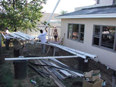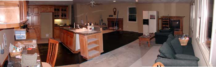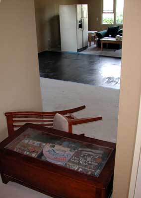 You may have realized looking at the pictures that the concrete joint, and therefore the black tar substance that we're not allowed to walk on, bisects the addition. And you can see that the refrigerator is on the far side of said divide. To get to the refrigerator, we had to exit the french doors in the dining room, cross the patio, then re-enter the house at the back door. |